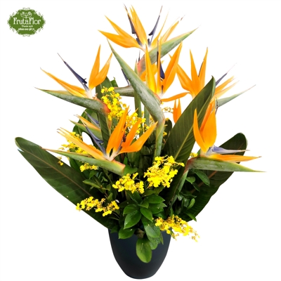Arranjo de estrelizias e orquídeas chuva de ouro, em peça de cerâmica, embalado para presente.