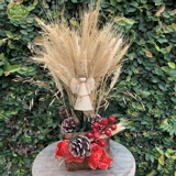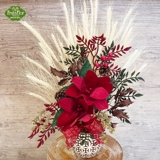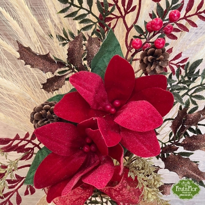 Arranjo de natal com poinsettias, trigos, frutinhas e folhagens em peça de cerâmica.
