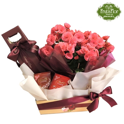 • Composição: 01 Begônia plantada (cor conforme disponibilidade), 01 Vinho da seleção Grand Cru (tinto ou branco) e 02 tabletes de chocolate Lindt de 100g cada.