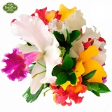 Buquê de noiva redondo irregular, com orquídeas, mini rosas porcelana e rosa bebê, suculentas e outras flores nobres.