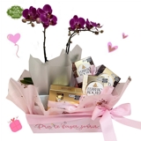 Cesta amor com coração de pelúcia, uma kalandiva plantada, pequena, embalada para presente, com aproximadamente 25cm de altura e dois tabletes de chocolates da Ferrero Rocher 90g sortidos.