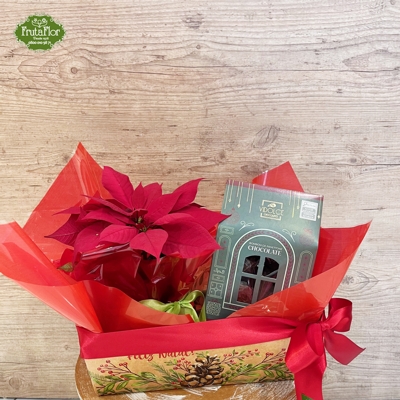 Poinsettia vermelha pequena (flor do natal) plantada, aproximadamente 25cm de altura, embalado para presente na cesta cartona. Bombom Panettone de Chocolate. De 200g da marca vidolce.
