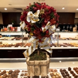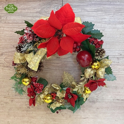 Guirlanda com frutinhas, pinhas e poinsettia e laço dourado. Aproximadamente 40cm de diâmetro.