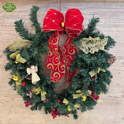 Guirlanda de natal com estrutura verde, laço vermelho, anjinho, bolinhas e frutinhas, enfeite de porta exclusivo, para decorar e deixar o ambiente mais natalino. Aproximadamente 40cm de diâmetro.
