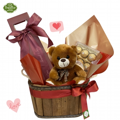 • Composição: 01 Cesto de madeira, 01 Urso de Pelúcia (aprox. 20cm), 01 Vinho da seleção Grand Cru e 01 caixa de bombons Ferrero Rocher (150g).